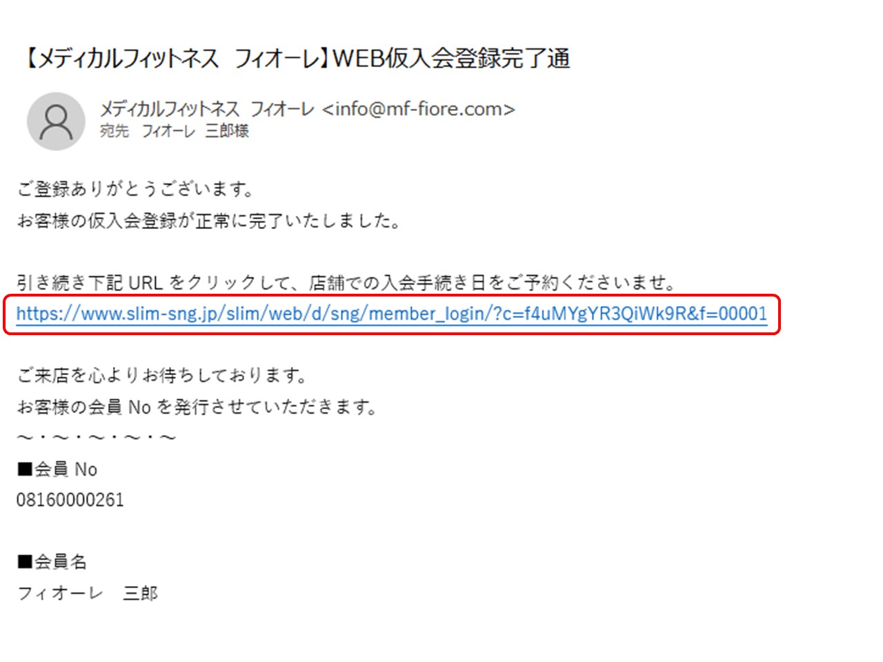 web予約入会申し込みのご登録が完了したら「WEB仮入会登録完了通知」が入力メールアドレスへ送信されます。