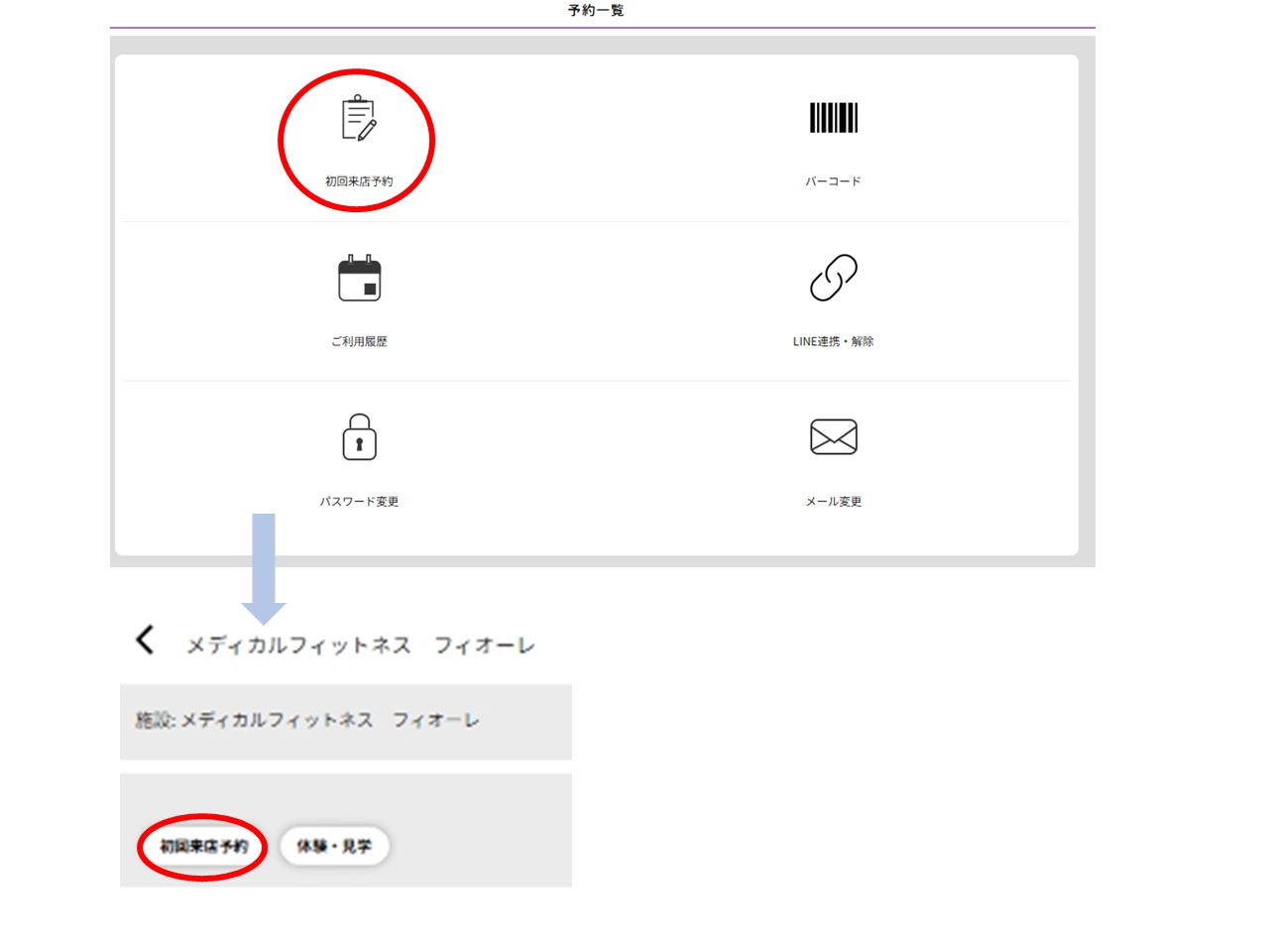 ●マイページの初回来店予約をクリックし入会手続き日のご予約をお願いします。
