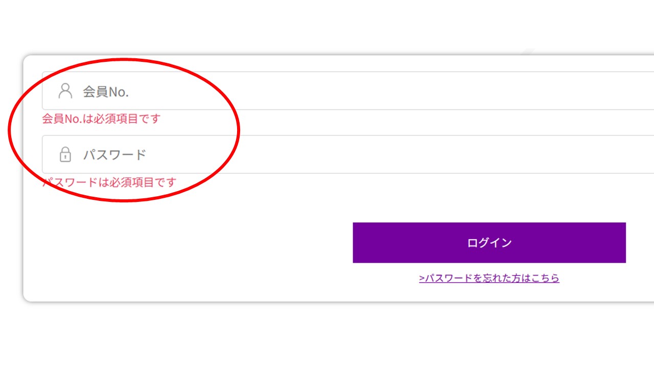 ●メールに記載されている会員番号と、web予約入会の申し込み時に設定されたパスワードを入力しマイページにログインしてください。