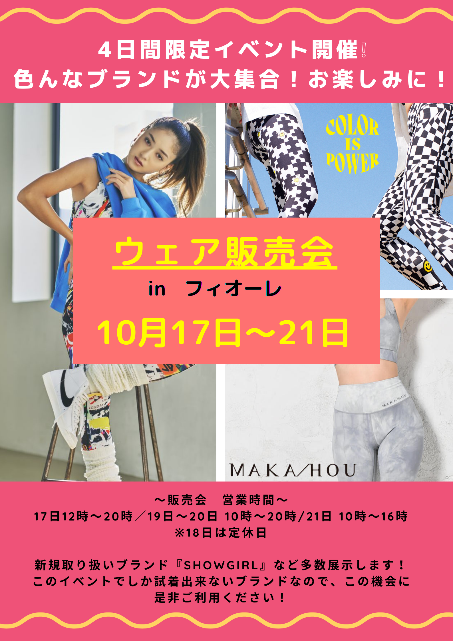 人気ブランド販売会 10/17~21 2022.10.14 10月17日~10月21日の期間 3F フィットネスエレベーターホールにて、 ウェアの販売会が行われます。 4日間限定なので、 ぜひ、この機会にお越しください。 詳細はこちらをクリック ⇩ Post ☆10月入会キャンペーン☆10/1~11/30 前の記事 <新規マシン導入>スキルミルを使ってみた会員様のお声 次の記事