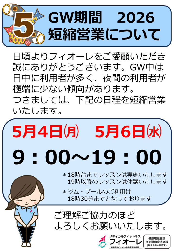 GW短縮営業のご案内 2026年 2026.04.22 日頃よりフィオーレをご愛顧いただき誠にありがとうございます。GW中は日中に利用者が多く、夜間の利用者が極端に少ない傾向があります。つきましては、下記の日程を短縮営業いたします。ご理解ご協力のほどよろしくお願いいたします。 5月4日㈪・5月6日㈬ 9:00~19:00 *18時台までレッスンは実施いたします。19時以降のレッスンは休講いたします。 *ジム・プールのご利用は18時30分までとなっております。 Post 忘れ物に関するご案内 前の記事